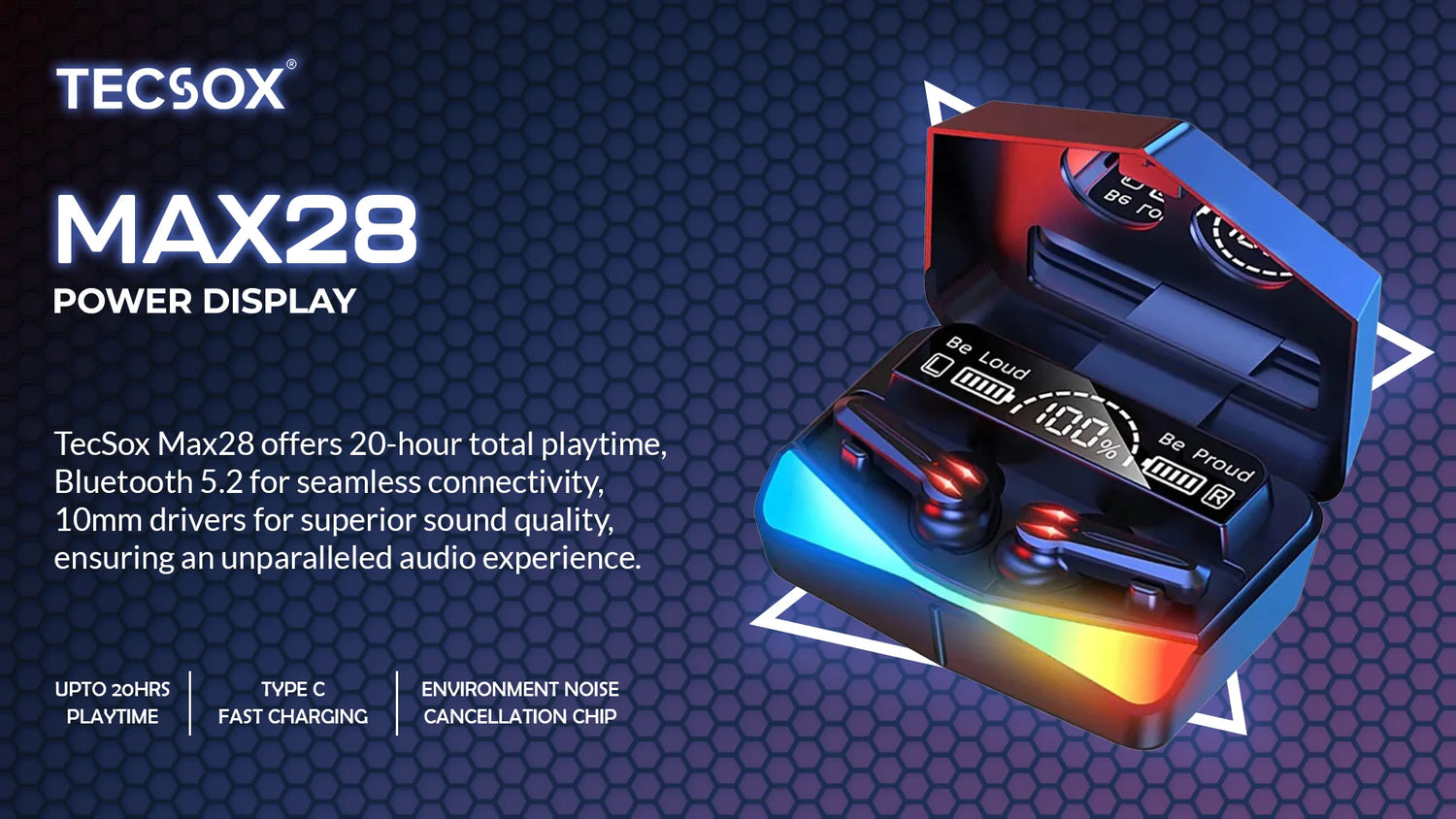 TecSox MAX 28 Bluetooth Earbuds offer 20-hour playtime with Bluetooth connectivity, balanced sound, and IPX water resistance for a reliable audio experience.