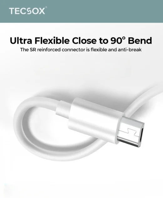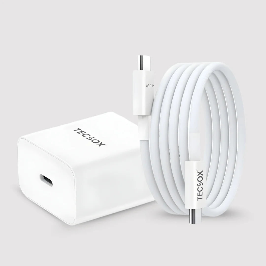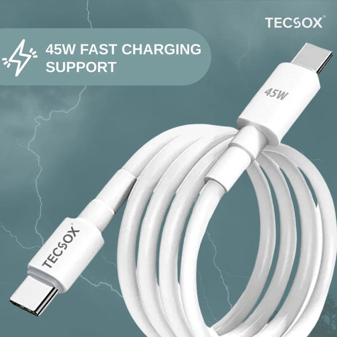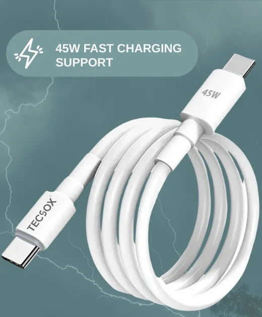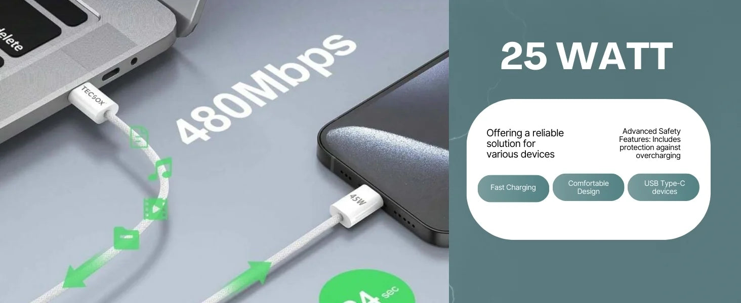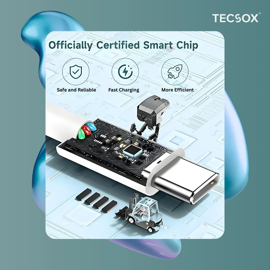 Comes with a 25W TecSox Adapter + Nylon Braided Type-C to Type-C Cable for unmatched durability and speed.