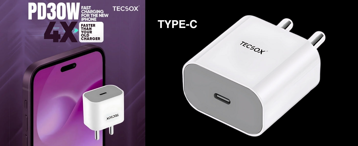 TecSox 30W Mobile Charger is a versatile, Fast Charging and Data Transfer, efficient travel companion that provides reliable power.