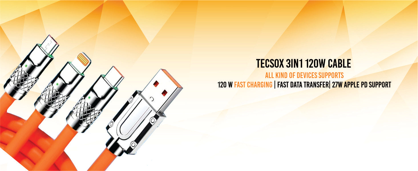 TecSox 3-in-1 Cable provides efficient performance across all devices, supporting 120W fast charging, 27W Apple PD, rapid data transfer for good productivity.