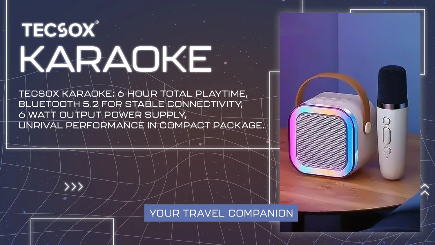 TecSox Karaoke Speaker offers Bluetooth, 6-hour playtime, multiple connection, dancing lights, voice-changing,IPX water resistance for portable entertainment.
