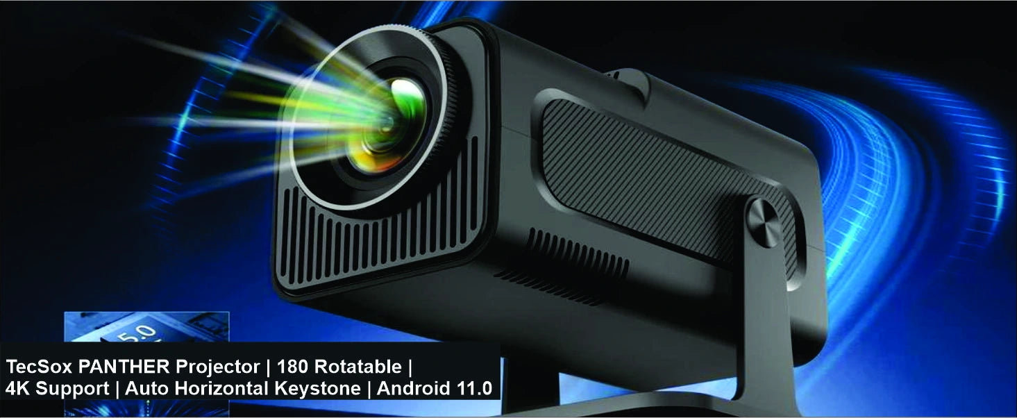 TecSox Panther Projector offers 4K video support, Android 11 OS, 180° rotation, Wi-Fi 6, and Bluetooth connectivity for an enhanced entertainment experience.