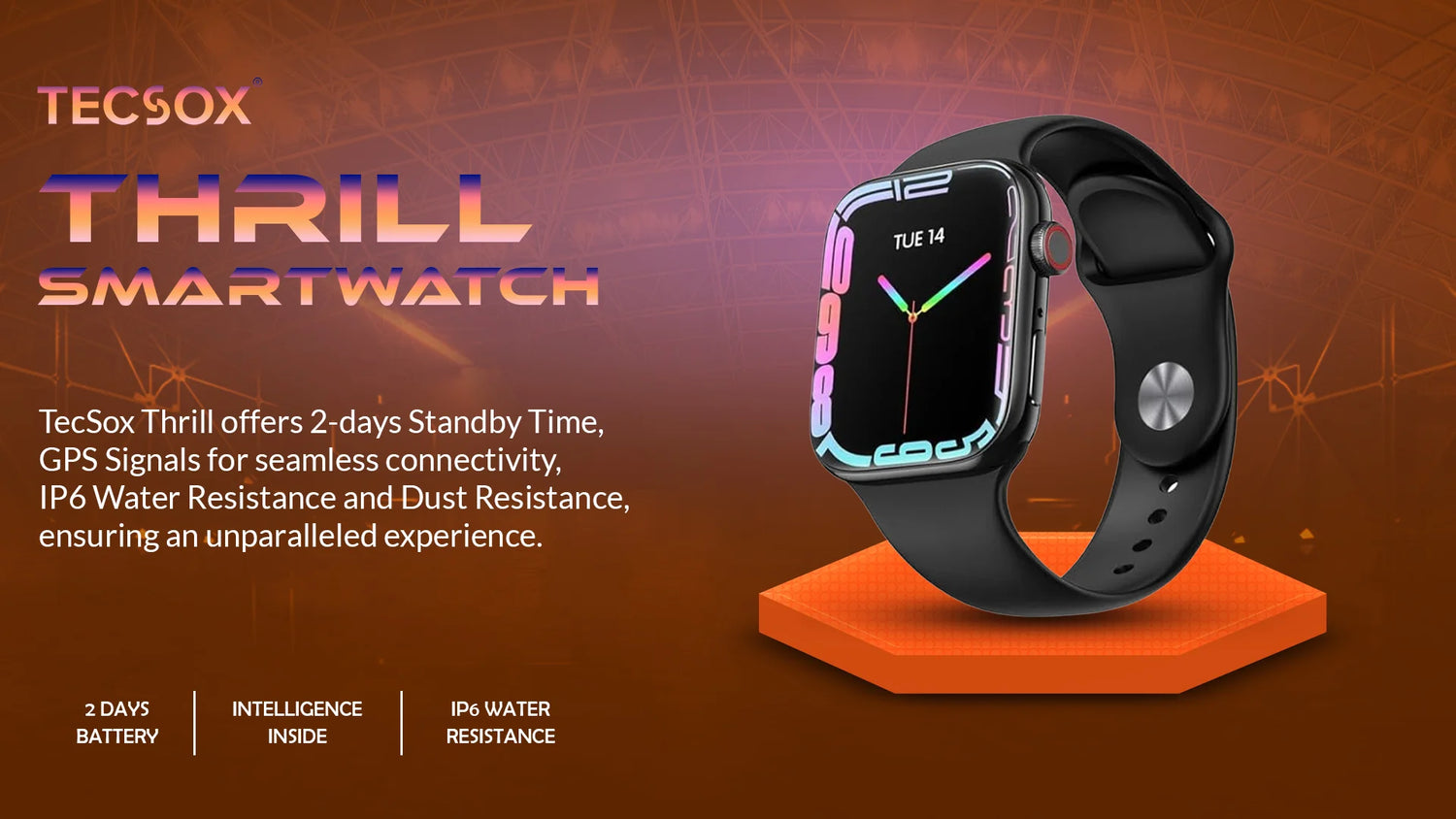 TecSox Thrill Smart Watch boasts a 2.19-inch HD display, 3-4 days battery life and IPX water resistance, providing a reliable and stylish wearable experience.