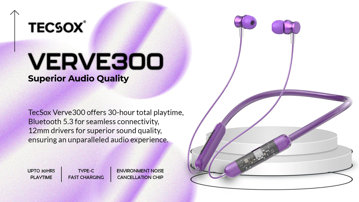 TecSox Verve 300 Neckband offers wireless Bluetooth connectivity 30-hour playtime, powerful audio and IPX water resistance for reliable and immersive quality.