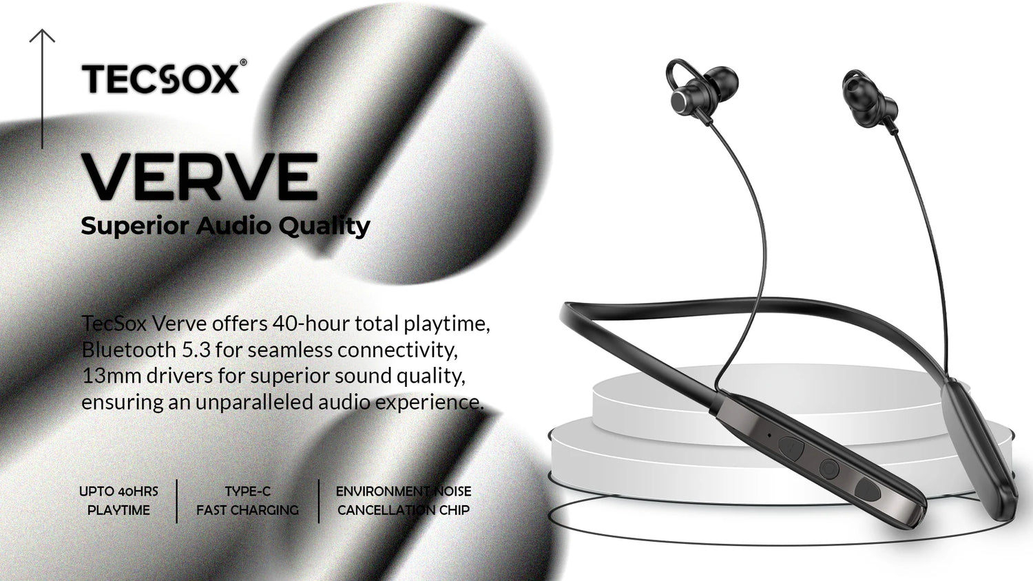 TecSox Verve Wireless Neckband boasts Bluetooth connectivity, 40-hour playtime, high bass, metallic touch controls, vibration alerts and IPX water resistance.